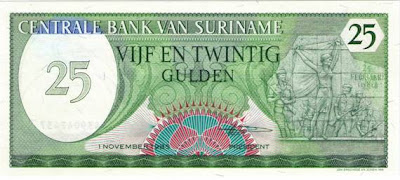 Dies ist der 5 Gulden Schein aus Surinam, einem Nachbarstaat von Guyana. Es ist der kleinste Wert aus der "Vogelserie", welche zur Jahrtausendwende verausgabt wurde. Sie ist quasi die Abschiedsserie vom Gulden, denn 2004 führte Surinam den Dollar ein.