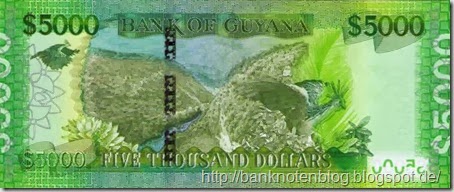Nach langer Zeit gibt es wieder Neuigkeiten aus Guyana: Zu Beginn des Jahres wurde ein 5.000 Dollar-Schein verausgabt. Bisher war eine 1.000-Dollar-Banknote der Höchstwert. Der neue 5.000er hat derzeit einen Umtauschkurs von rund 18 Euro. Die neue Banknote besticht durch die intensive Farbe und den neuen Sicherheitsmerkmalen.